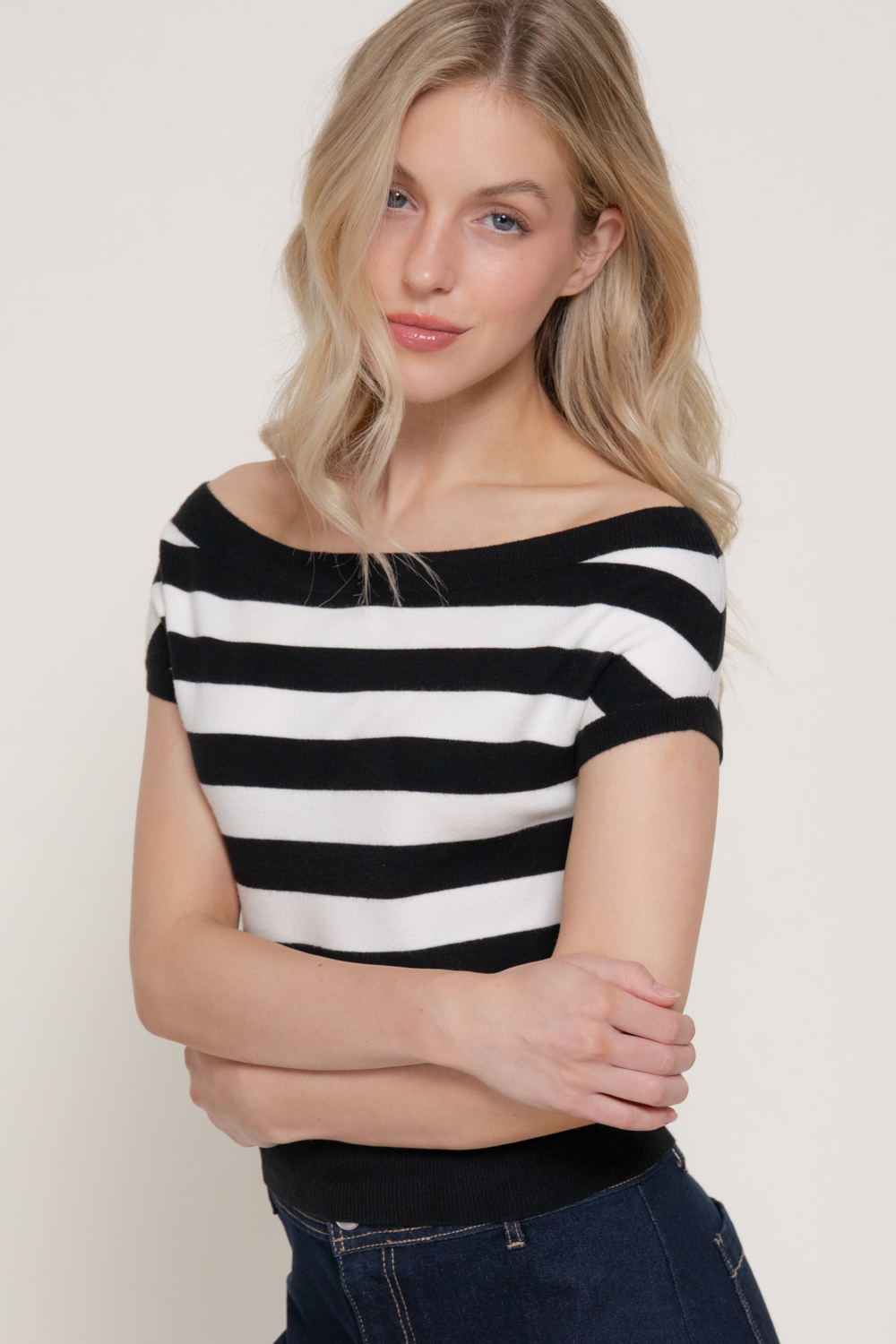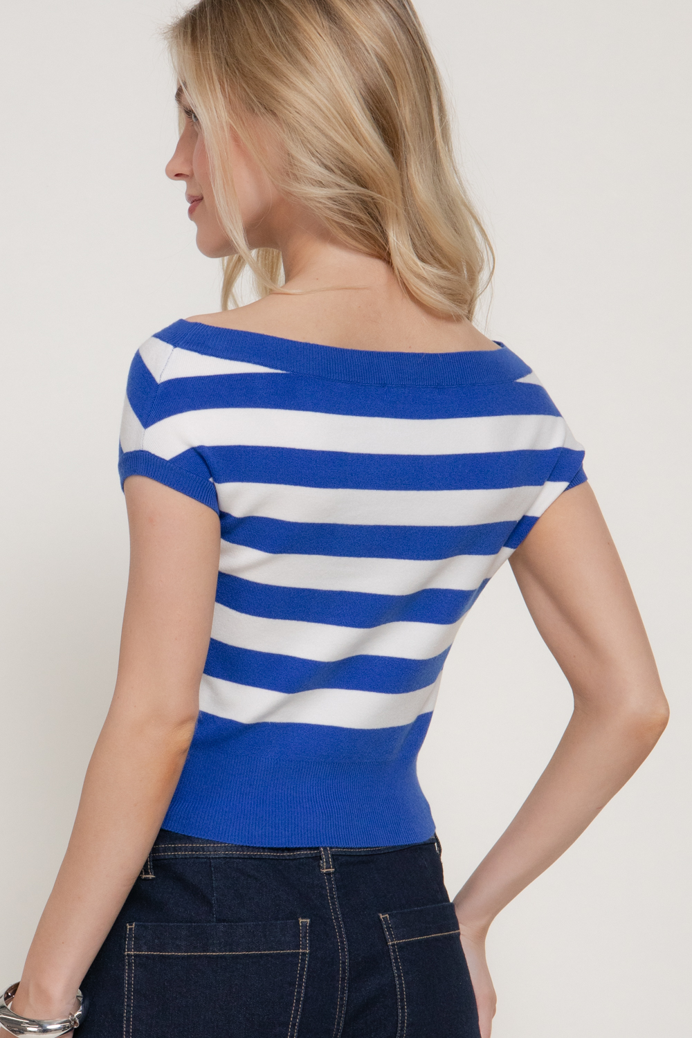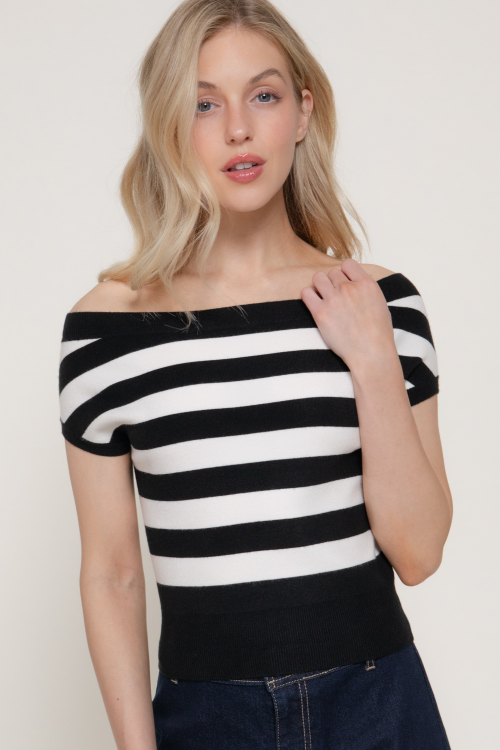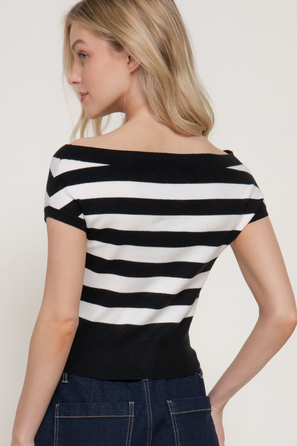 TOP DE SUÉTER A RAYAS CON HOMBROS DESCUBIERTOS Y MANGA CORTA