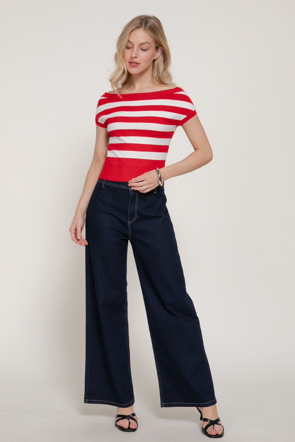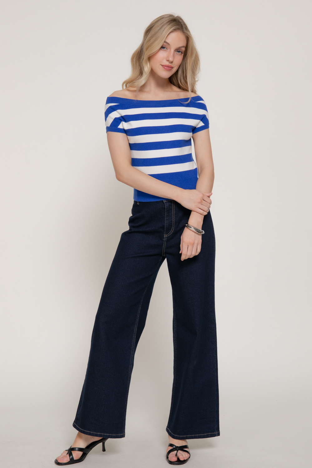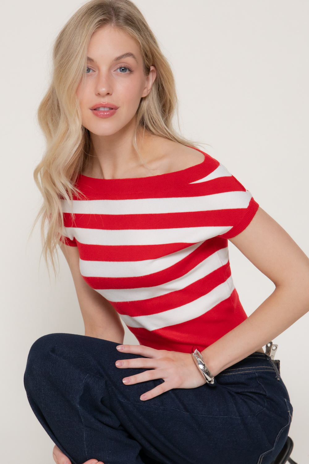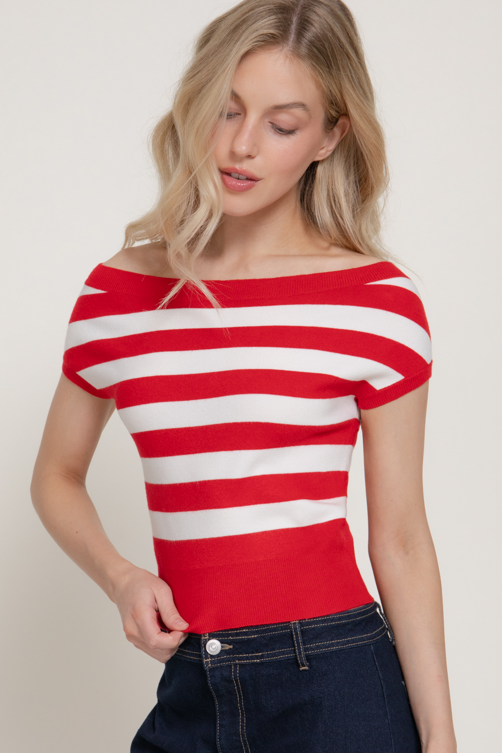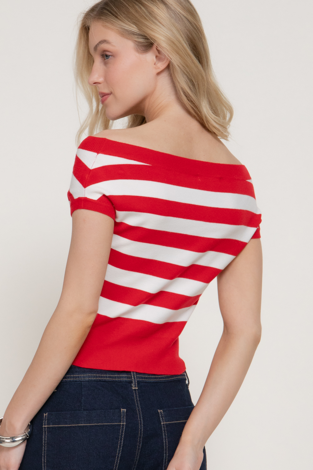 TOP DE SUÉTER A RAYAS CON HOMBROS DESCUBIERTOS Y MANGA CORTA
