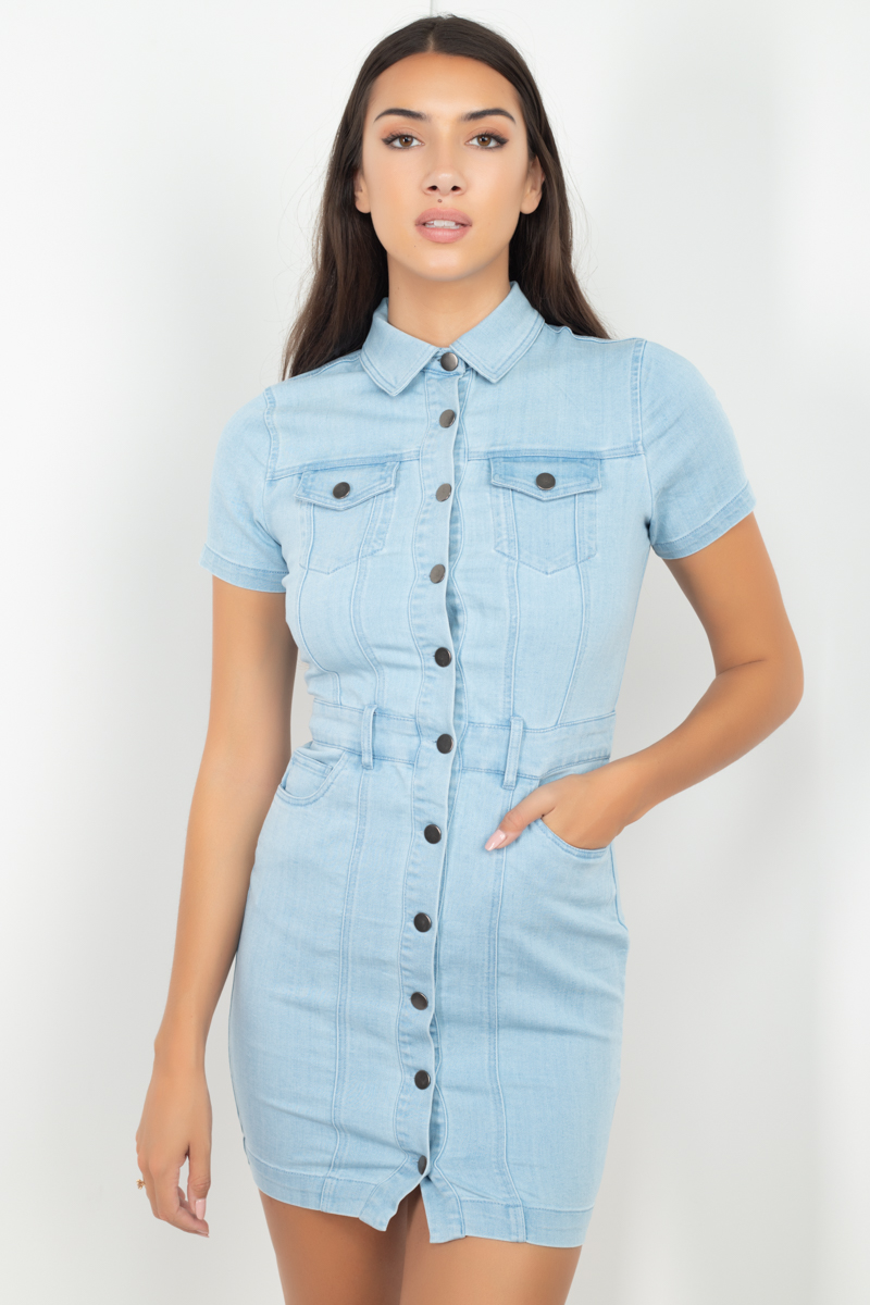 Un mini vestido tejido de mezclilla con cierre frontal con botones, trabillas para el cinturón, construcción de cinco bolsillos delanteros, mangas cortas, cuello básico y costuras estilo princesa.